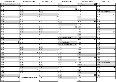 | Kuukausi | Työpäivien lukumäärä | Muut erityiset päivät |